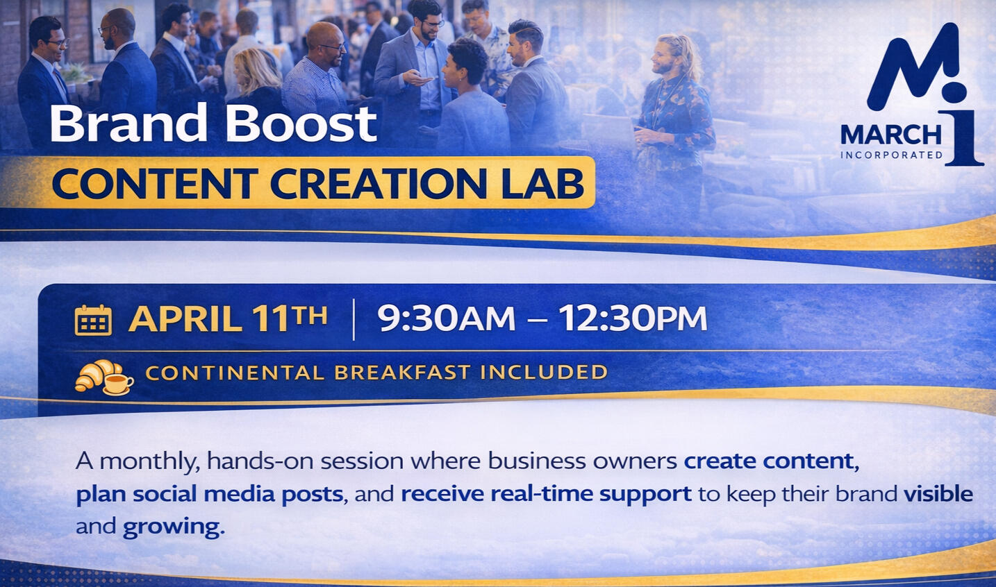 The Brand Boost Content Creation Lab was created in response to business owners who shared the same challenge: staying consistent with content and maintaining visibility online. Hiring a social media manager or content creator can costs $500 to $5,000 per month, but this lab gives you the tools and support to take control of your own brand at a fraction of the costs.For $75/month, join a small, hands-on working session where you'll curate, organize, and schedule content alongside other business owners. Continental breakfast is included. Subscription required; skipped months return at $99. Join the lab and boost your brand! Prerequisite: Brand Boost / Collab Crush WorkshopThe Brand Boost Lab is a continuation of the workshop experience and is exclusively available only to participants who have completed the Brand Boost / Collab Crush Workshop.April 11 | $75